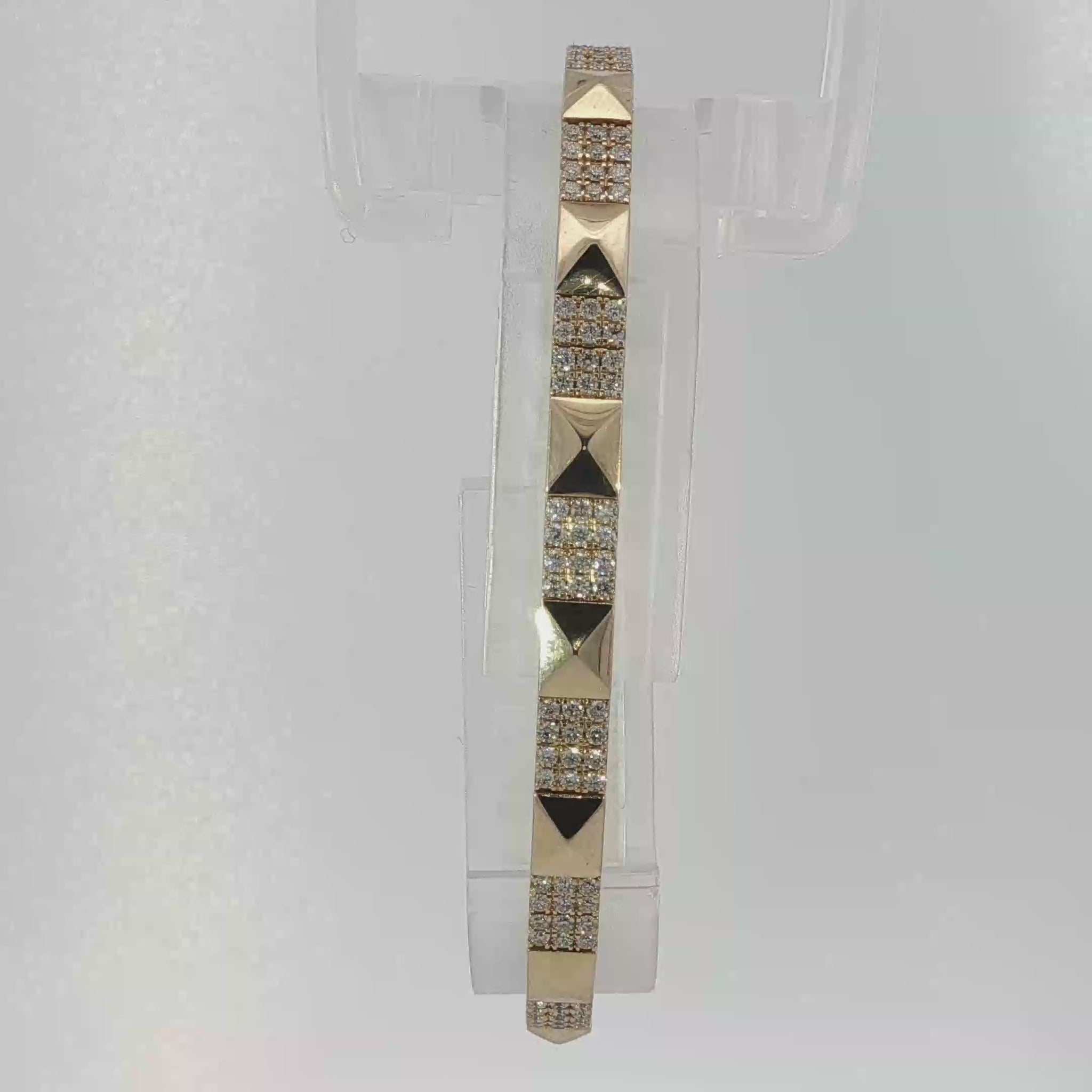 Embrace radiant elegance with this meticulously crafted yellow gold bangle. This distinctive bracelet features alternating sections of brilliant round cut diamonds and sleek geometric accents, creating a harmonious blend of sparkle and modern design. It is a sophisticated statement piece designed to adorn your wrist with timeless allure.