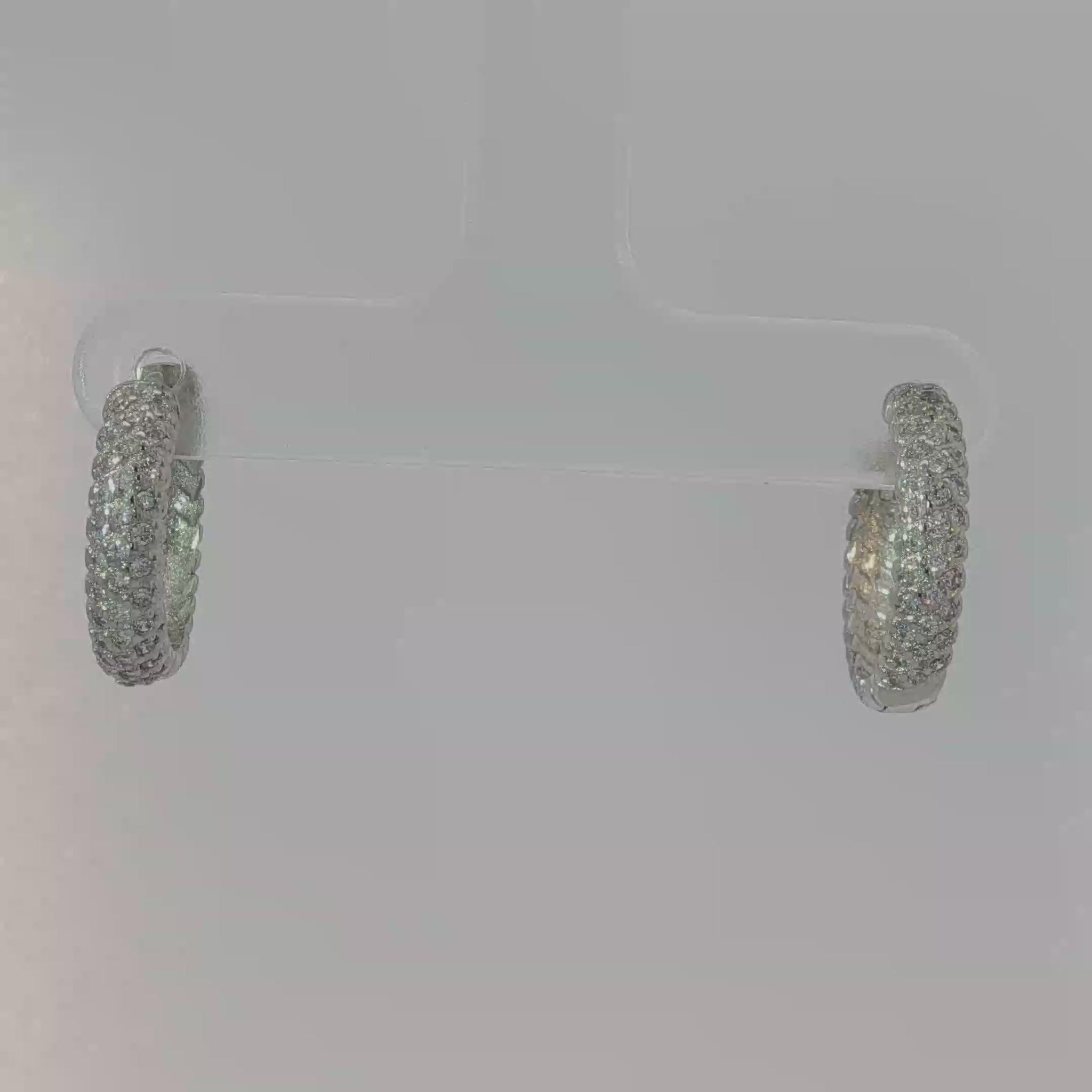 These classic hoop earrings are crafted in polished white gold plated silver. The earrings are pave-set with round brilliant cut diamonds which display excellent cut, symmetry and polish. The colorless diamonds add an unparalleled sparkle and brilliance to these must have earrings.