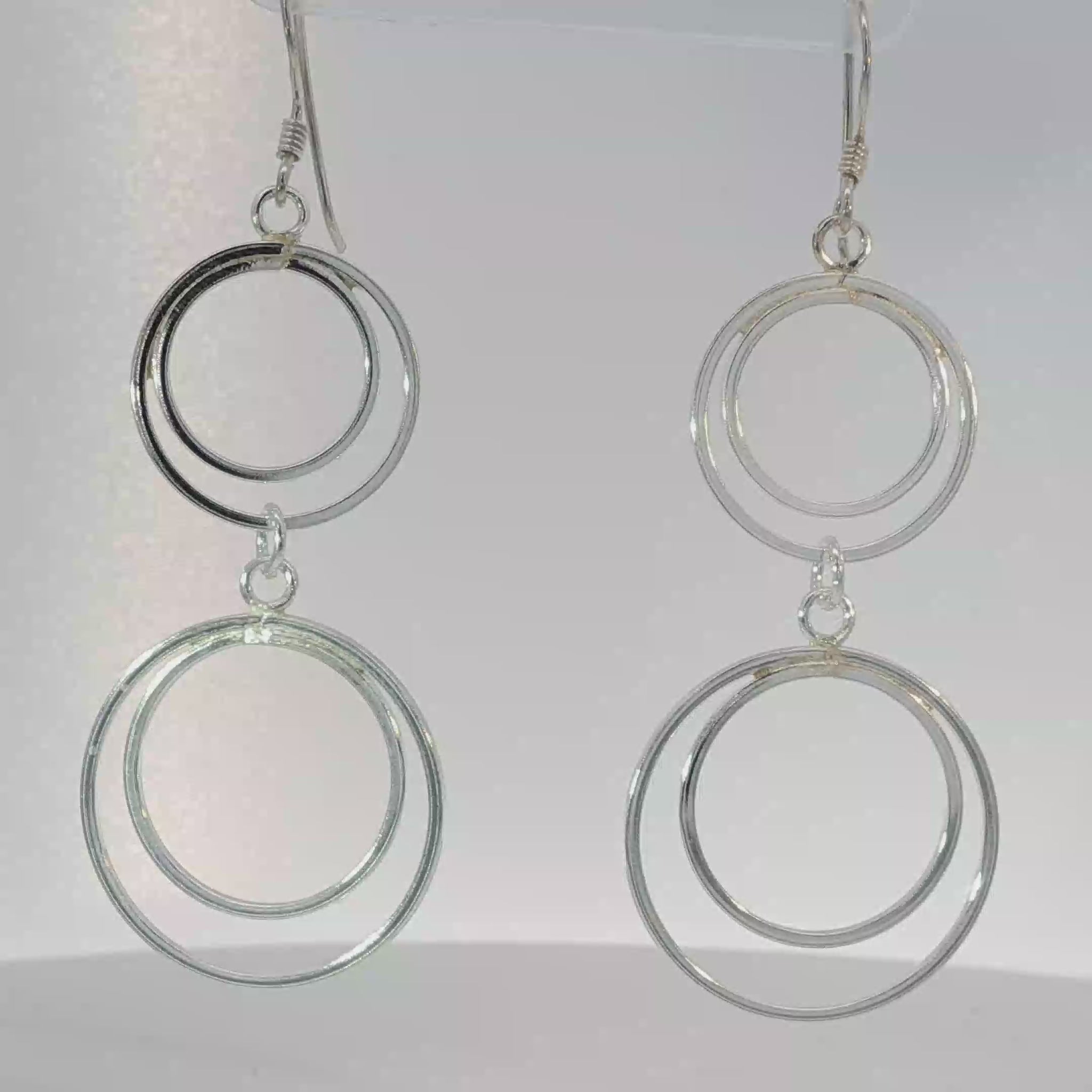 Add a modern touch to your ensemble with these chic sterling silver dangle earrings. The minimalist design features interlocking double circle motifs, creating a stylish and elegant look. These lightweight earrings are perfect for everyday wear or special occasions, offering a sleek and sophisticated complement to any outfit.