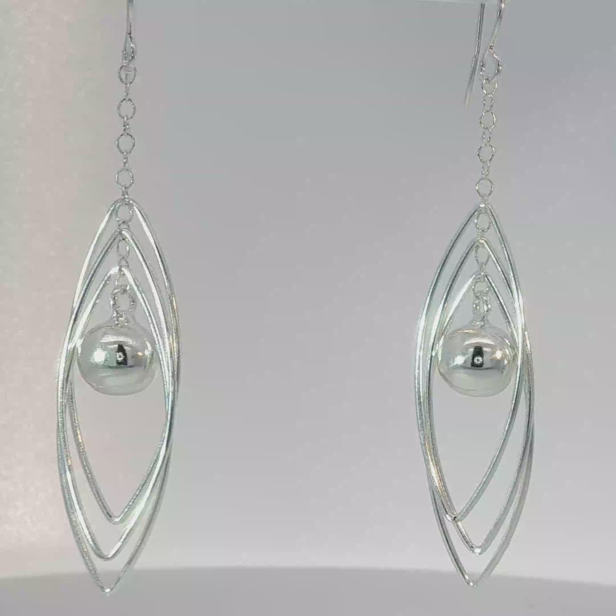 Elevate your style with these captivating sterling silver dangle earrings. Featuring a contemporary triple-layered oval design, each earring is anchored by a shimmering silver sphere, creating a mesmerizing visual appeal. Lightweight and elegant, these earrings are perfect for adding a touch of modern sophistication to any ensemble.