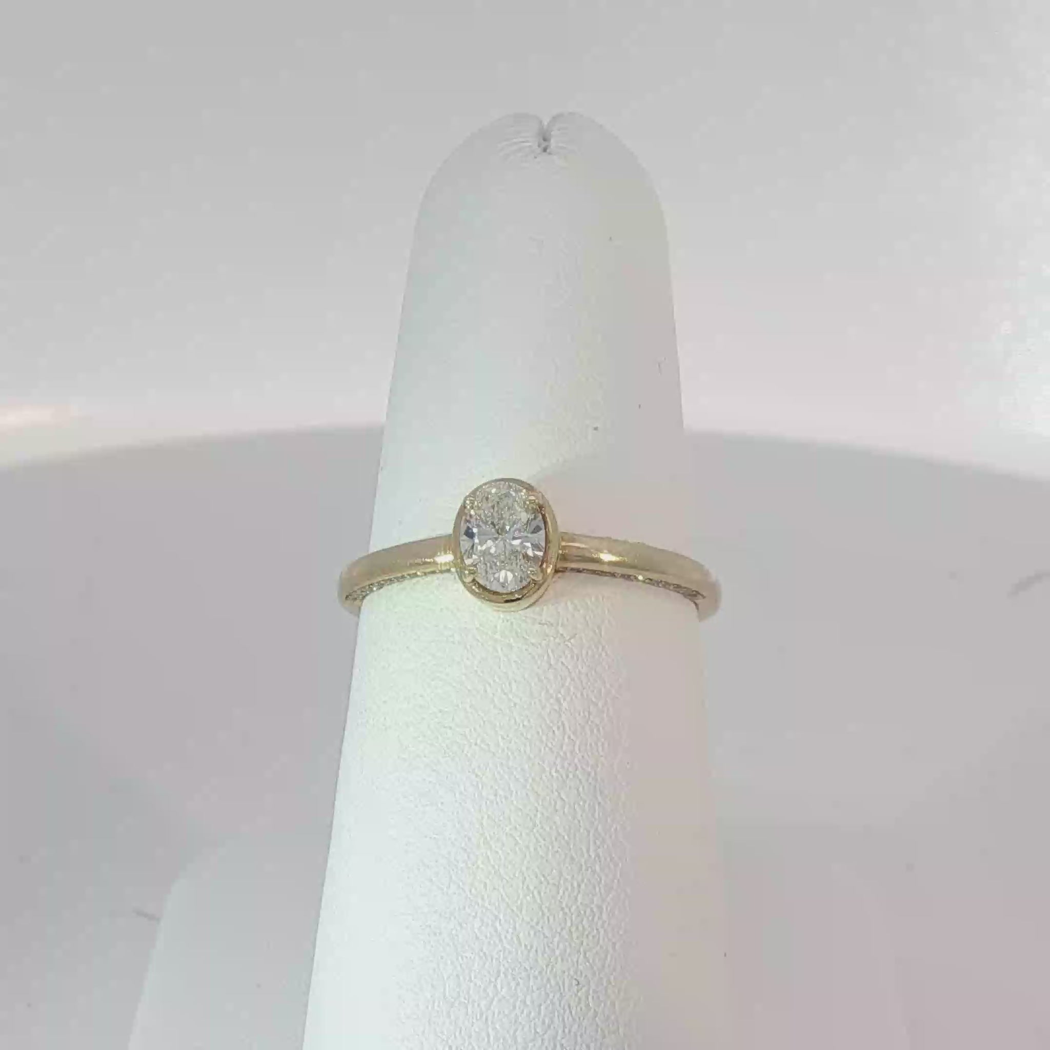 Experience timeless elegance with this exquisite solitaire ring. The mesmerizing oval cut diamond, known for its unique charm, is set in lustrous yellow gold. This brilliant cut diamond sparkles with exceptional fire and brilliance, creating a captivating display of light. A classic design, meticulously crafted for enduring beauty.