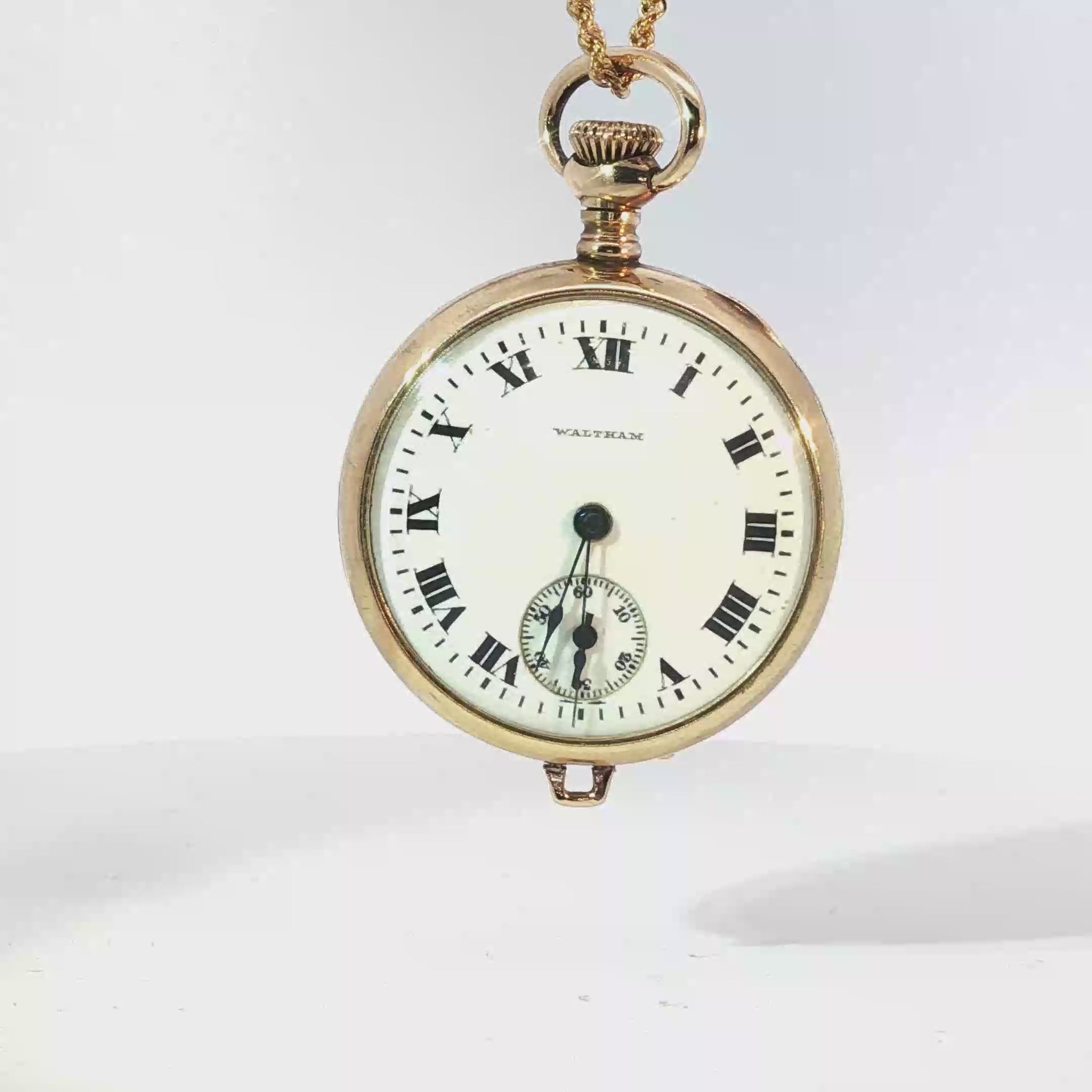 Exquisite vintage Waltham pendant watch crafted from radiant yellow gold. This timepiece, with its classic Roman numeral dial, offers a glimpse into horological history. Suspended gracefully, the watch seamlessly blends functionality with timeless elegance, making it a statement piece for any discerning collector.