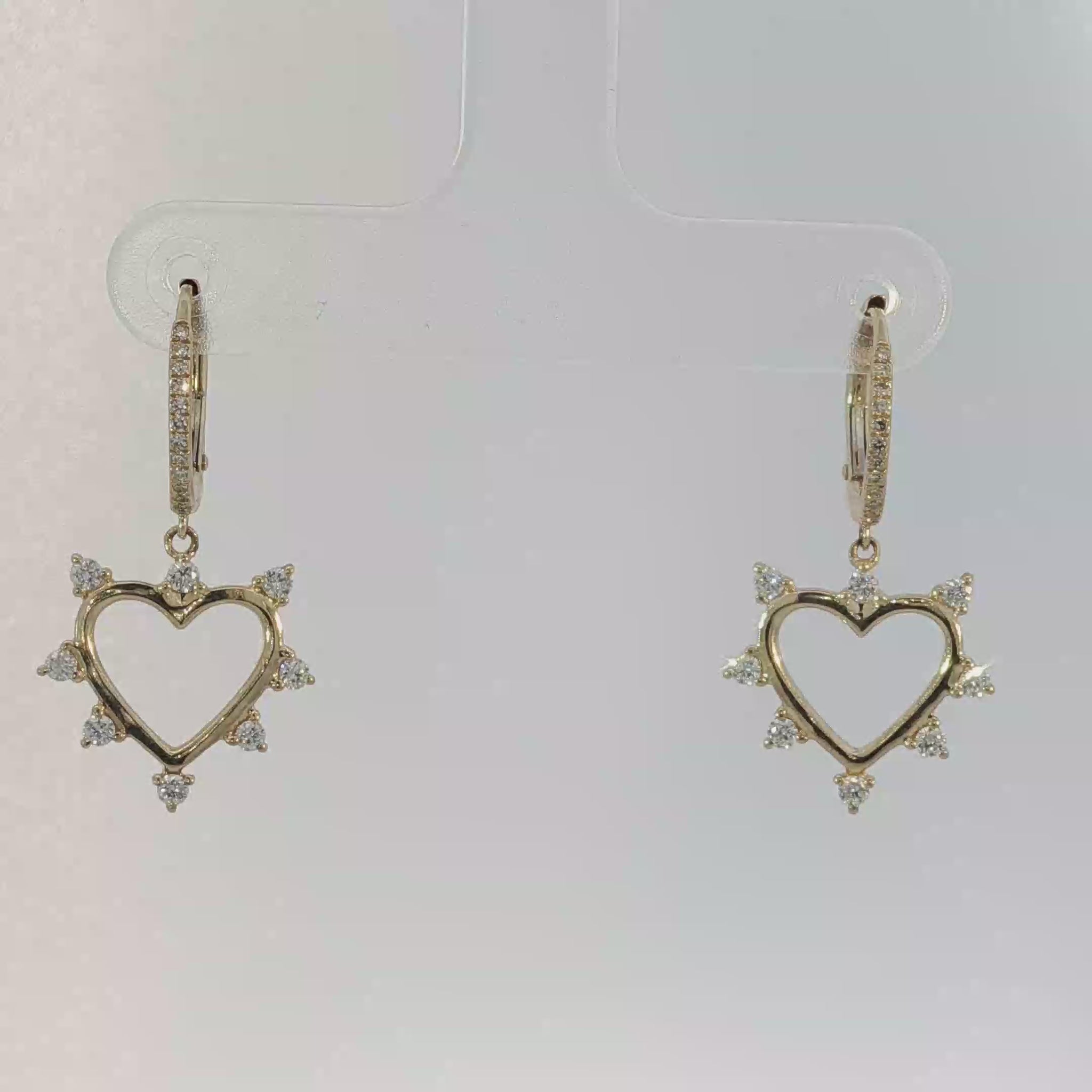 Adorn yourself with these captivating dangle earrings featuring hearts. Crafted in radiant yellow gold, each earring showcases a delicate, open heart design embellished with shimmering round cut diamonds. These earrings are a testament to timeless elegance and modern style, perfect for adding a touch of sparkle to any ensemble.