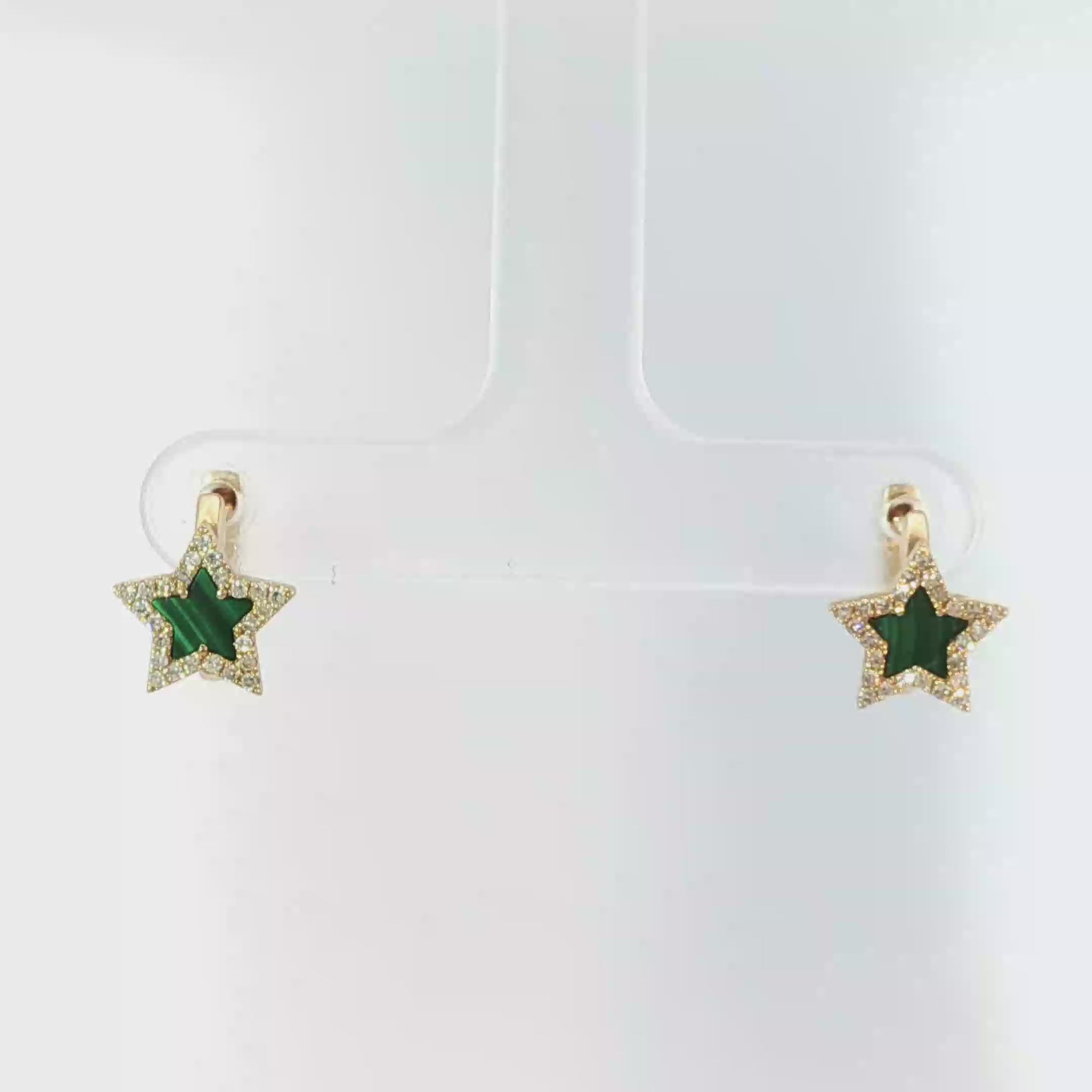 Elevate your style with these captivating star hoop earrings. Crafted in gleaming yellow gold, these earrings feature mesmerizing cabochon-cut malachite gemstones in a unique star shape. The opaque green malachite stones exude natural beauty and positive energy, making these hoops a stellar addition to any jewelry collection.